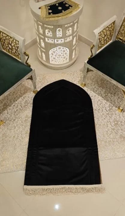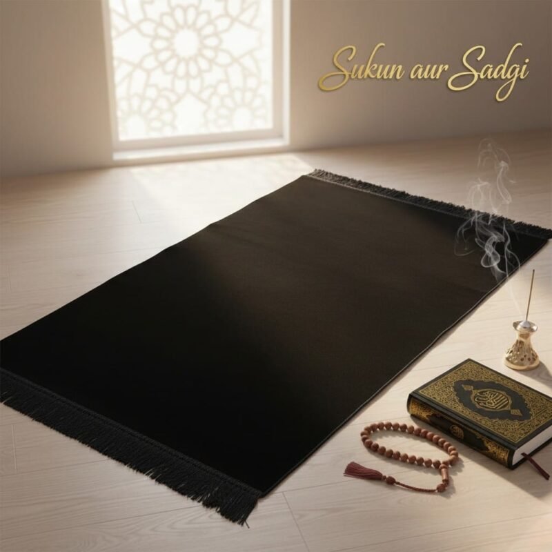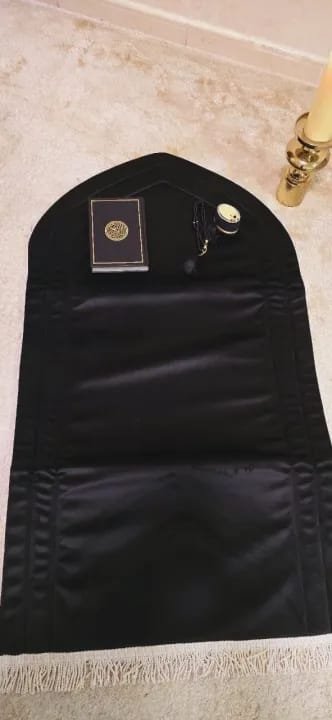 Elevate your spiritual practice with this elegant, solid black prayer mat. Crafted from high-quality, plush velvet, it offers a soft and comfortable surface for daily prayers. Its minimalist, fringe-trimmed design is free from distracting patterns, allowing for deeper focus and tranquility.