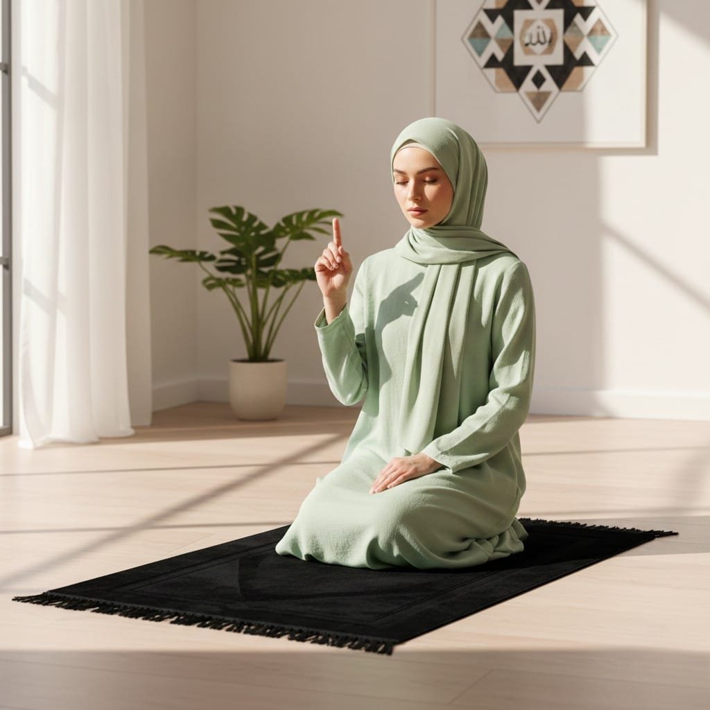 Sajadah (Prayer Rug): A solid black, velvet-textured rectangular rug with fringed edges. It is used to provide a clean and dedicated space for prostration.